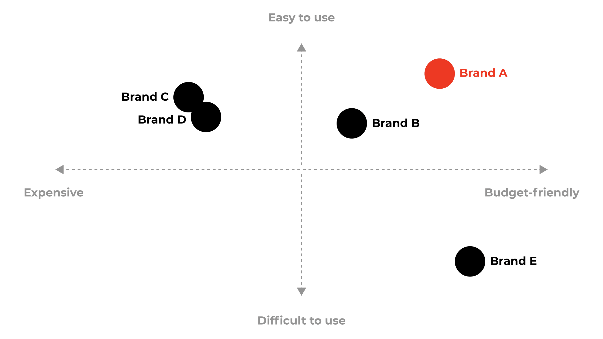 - En qué consiste: Un mapa perceptual es una representación visual de la posición de su marca en relación con la de sus competidores en los atributos o percepciones más importantes para su negocio. En el ejemplo siguiente, la marca A se percibe como económica y fácil de usar, mientras que la competencia se percibe como más cara o más difícil de usar, o ambas cosas.